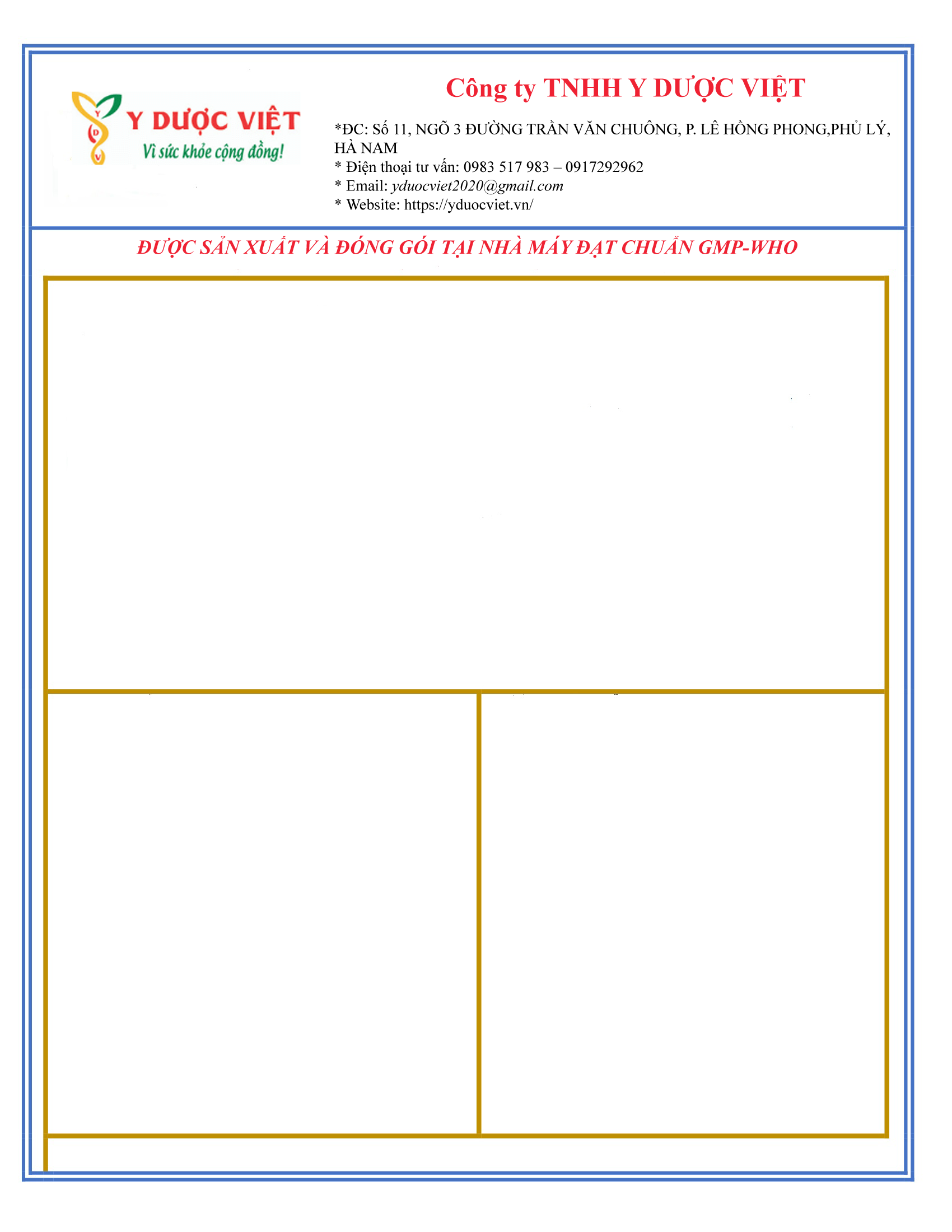 * ĐC: số 11, NGÕ 3 ĐƯỜNG TRẦN VĂN CHUÔNG, P. LÊ HỒNG PHONG,PHỦ LÝ, HÀ NAM * Điện thoại tư vấn: 0983 517 983 – 0917292962 * Email: yduocviet2020@gmail.com